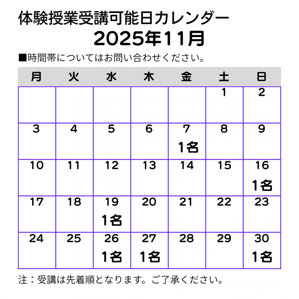 > 2025年11月の体験授業受講可能日カレンダーを掲載しました。