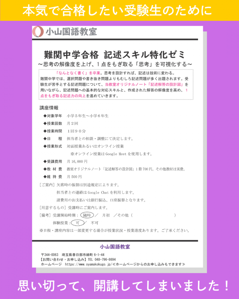記述を得意武器に変えたい新小5・新小6生の挑戦を待っています。